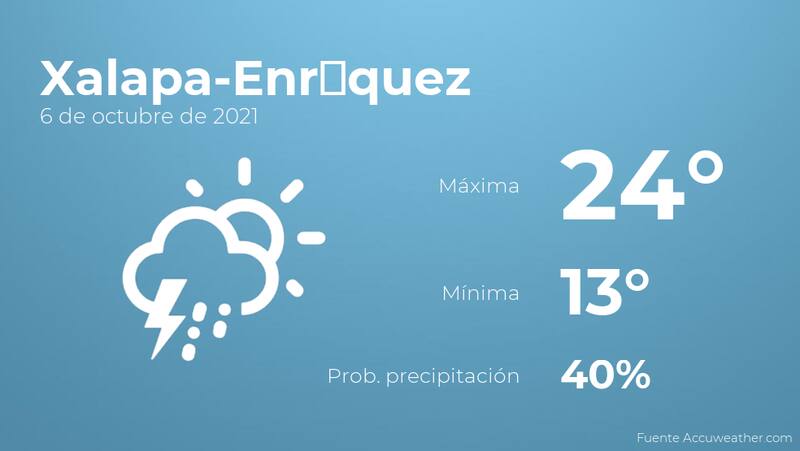 Según la información de accuweather.com, hoy por la mañana en Xalapa-Enríquez se esperan nubes y claros con probabilidad de tormentas y lluvia. Por la tarde se prevén nubes y claros con probabilidad de tormentas acompañadas de lluvia. En relación a las temperaturas, estas se moverán entre los 24 grados de máxima y 13 de mínima. Junto a todo esto, se esperan vientos de carácter flojo con valores de hasta 13 km/h.