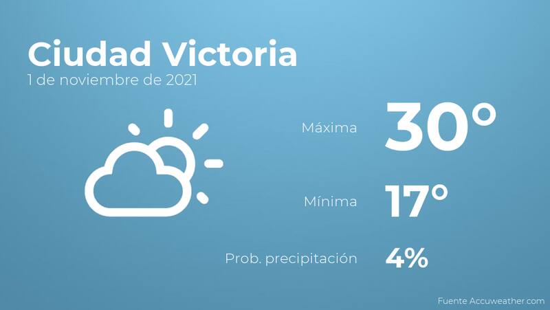 Según la información de accuweather.com, hoy por la mañana en Ciudad Victoria se prevé escasa nubosidad. Según pasen las horas se esperan cielos despejados. Con respecto a las temperaturas, oscilarán entre una máxima de 30 y una mínima de 17 grados. Viento de carácter débil con cifras de hasta 17 km/h.