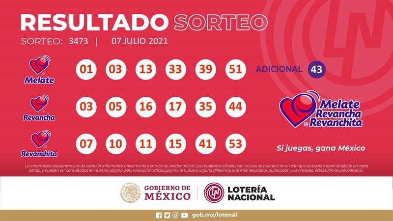 Este domingo 18 de julio se realizaron los sorteos de Pronósticos de la Lotería Nacional en las modalidades de Melate, Revancha, Revanchita, Tris y Chispazo. Te damos a conocer los números ganadores.