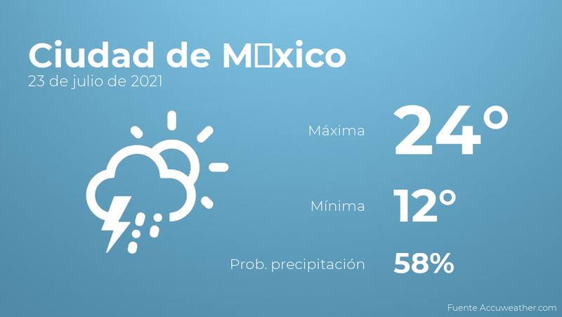 Según la información de accuweather.com, hoy por la mañana en Ciudad de México habrá nubes y claros con probabilidad de tormentas acompañadas de lluvia. A medida que avance el día se esperan nubes y claros con probabilidad de tormentas y lluvia. En cuanto a las temperaturas, estarán entre los 24 grados de máxima y 12 de mínima. Viento sin apenas intensidad con rachas de hasta 22 kilómetros por hora.