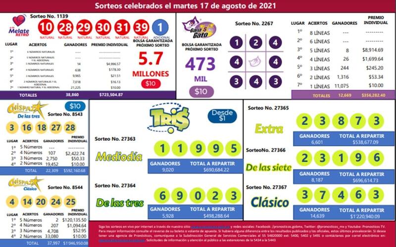 - Números ganadores de Chispazo De las Tres: 7,9,21,26,27