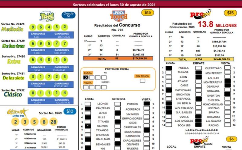 La Lotería Nacional llevó a cabo este lunes, 30 de agosto, los sorteos de las cinco modalidades de TRIS, los dos sorteos de Chispazo y los tres sorteos de Melate. Aquí te presentamos los números y combinaciones ganadoras: