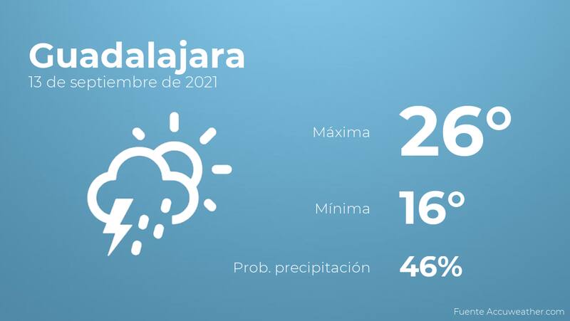 Según la información de accuweather.com, hoy por la mañana en Guadalajara habrá más nubes que claros con probabilidad de tormentas acompañadas de lluvia. Por la tarde se prevén cielos cubiertos con probabilidad de lluvia. Con respecto a las temperaturas, estas variarán entre los 26 grados de máxima y 16 de mínima. Además, se esperan vientos de carácter flojo con cifras de hasta 11 kilómetros por hora.