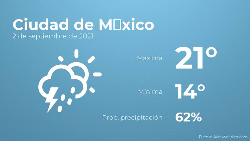 Según la información de accuweather.com, hoy por la mañana en Ciudad de México tendremos más nubes que claros con probabilidad de tormentas acompañadas de lluvia. A medida que avance el día se prevén más nubes que claros con probabilidad de lloviznas generalizadas. En cuanto a las temperaturas, estas se moverán entre los 21 grados de máxima y 14 de mínima. Además, se esperan vientos de poca intensidad con valores de hasta 20 kilómetros por hora.