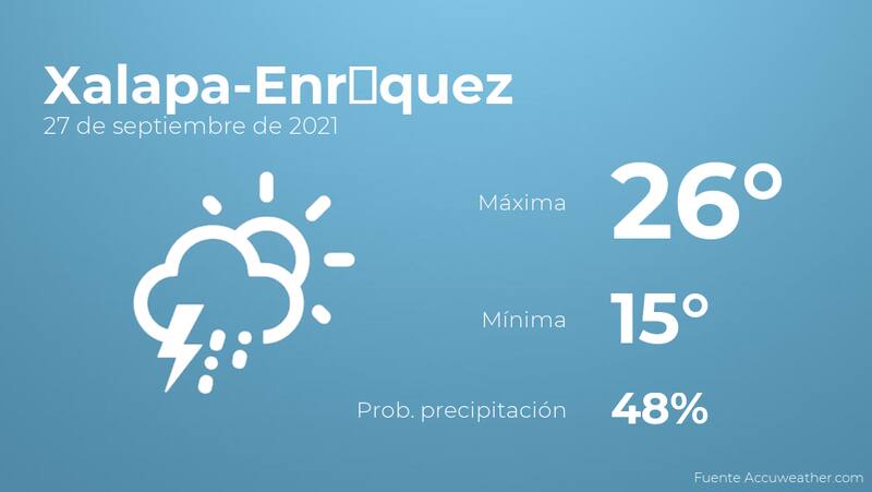 Según la información de accuweather.com, hoy por la mañana en Xalapa-Enríquez tendremos nubes y claros con probabilidad de tormentas y lluvia. A medida que avance el día habrá nubes y claros con probabilidad de tormentas y lluvia. Por lo que respecta a las temperaturas, estas se moverán entre los 26 grados de máxima y 15 de mínima. En general, vientos del sureste de carácter flojo con rachas de hasta 15 km/h.