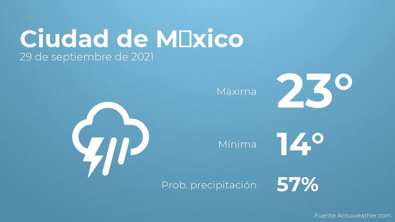 Por la mañana en Ciudad de México el cielo estará cubierto con probabilidad de tormentas y lluvia. Por la tarde el cielo estará cubierto con probabilidad de tormentas acompañadas de lluvia. Con respecto a las temperaturas, estas oscilarán entre los 23 grados de máxima y 14 de mínima. En general, vientos del sur de carácter flojo con valores de hasta 18 km/h.