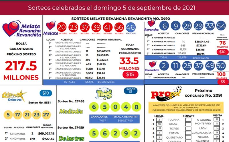 La Lotería Nacional llevó a cabo este domingo, 5 de septiembre, los sorteos de las cinco modalidades de TRIS, los dos sorteos de Chispazo y los tres de Melate. Aquí te presentamos los números y combinaciones ganadoras: