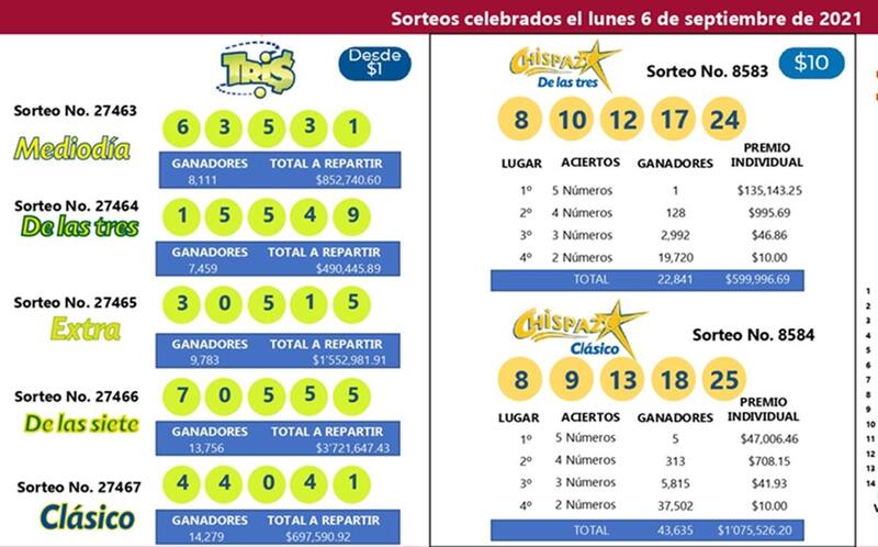 La Lotería Nacional llevó a cabo este lunes, 6 de septiembre, los sorteos de las cinco modalidades de TRIS y los dos sorteos de Chispazo. Aquí te presentamos los números y combinaciones ganadoras: