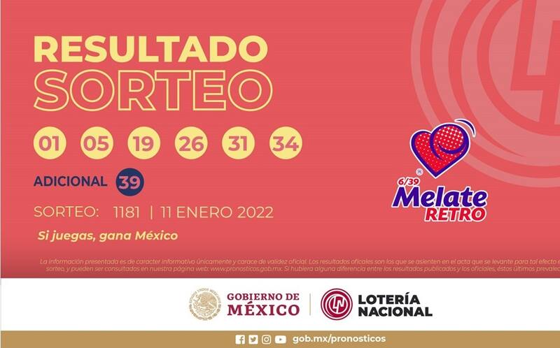 Números ganadores de Melate Retro: 01 05 19 26 31 34