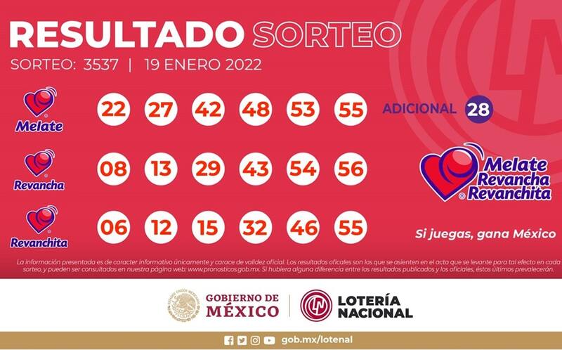 Números ganadores de Melate: 22, 27, 42, 48, 53, 55