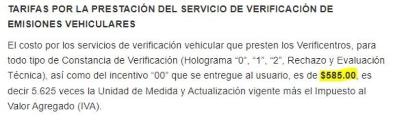 De acuerdo con la SEDEMA el costo de la verificación vehicular en la Ciudad de México es de $585.00 pesos.
