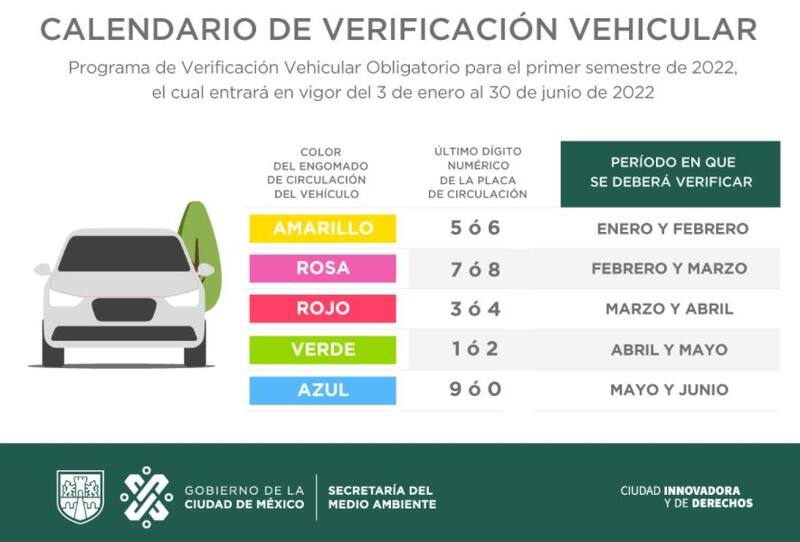 Durante enero y febrero del 2022, los vehículos que deben realizar la verificación vehicular en la Ciudad de México son los que tengan terminación de placas 5 o 6 y engomado amarillo.