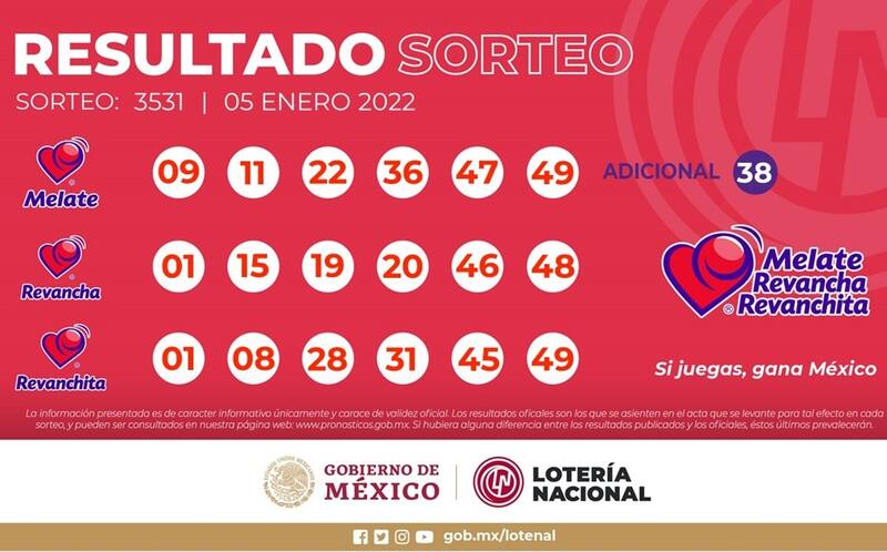Números ganadores de Melate Revanchita: 01 08 28 31 45 49