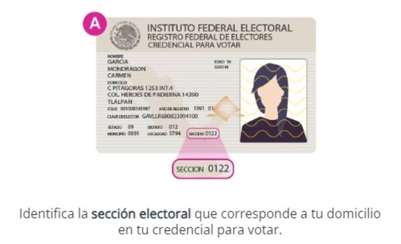 También habrá que ubicar en tu INE la "SECCIÓN" en la que votas, misma que la encuentras en la parte frontal de la misma. Te puedes guiar con siguiente imagen: