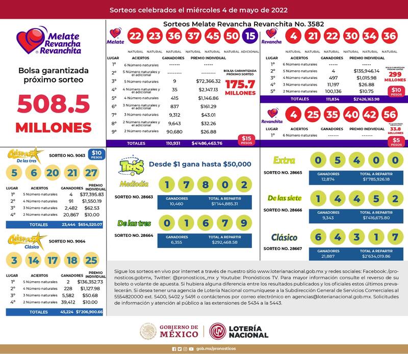 Mientras que el de Revancha cuesta 10 pesos más por cada combinación de 6 números, y el de Revanchita es de 5 pesos más. Si deseas comprar los tres, daría un total de 30.00 pesos mexicanos.