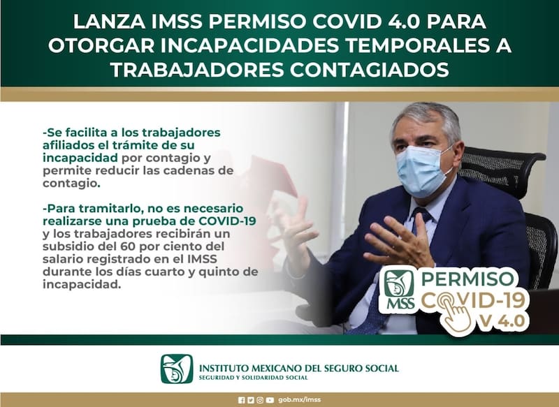 El Instituto Méxicano del Seguro Social (IMSS) lanzó de nuevo la herramienta digital Permiso Covid-19 en su versión 4.0, con la finalidad de que los derechohabientes puedan acceder de una manera sencilla, y sin salir de casa, a una incapacidad de cinco días.