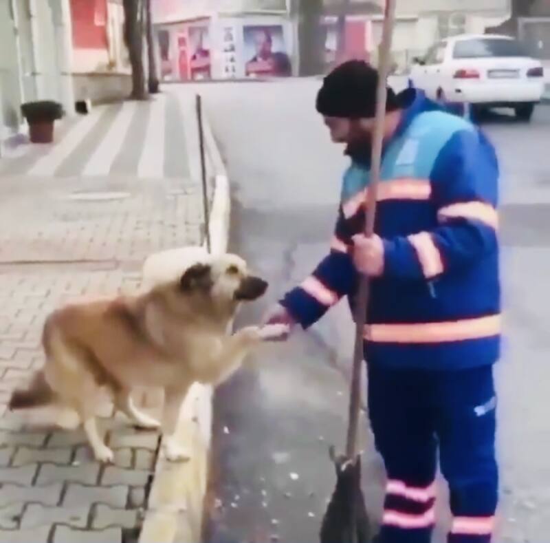 Con escoba en mano, el trabajador de la limpieza se dispone a barrer la calle cuando el canino se le acerca. Él le pide que suba a la banqueta y la reacción del perro es darle la pata izquierda.