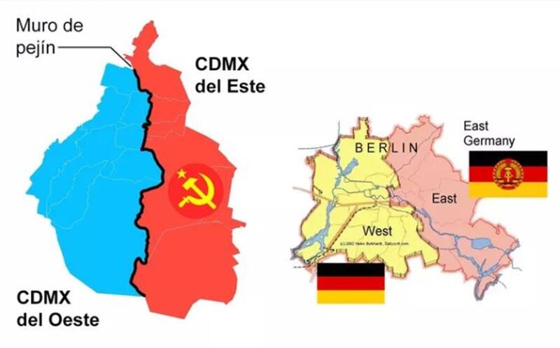 Luego de que los datos del Programa de Resultados Electorales Preliminares (PREP), del Instituto Nacional Electoral (INE), marcarán un resultado histórico al dividir el mapa electoral de la Ciudad de México entre Morena y la coalición hecha por el PAN-PRI-PRD, donde la derecha se llevó las alcaldías del poniente y la izquierda las del oriente, usuarios en redes sociales comenzaron a lanzar memes y chistes en la web comparando la división partidista de la capital con el muro que dividía la Alemania Oriental y Alemania Occidental levantada en 1945.