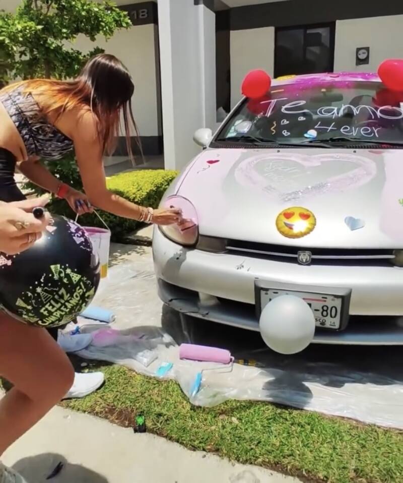 Dibujó un gran corazón en el cofre del vehículo, puso brillitos, colocó globos, más corazones pequeños y papeles adheribles para luego anotar en el parabrisas "Te amo 4 ever" y en las ventanillas "Feliz cumple, amor".