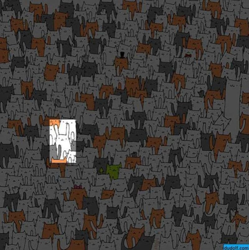 Este no es el primer acertijo visual de Dudolf que ha roto al Internet, el conejo blanco escondido entre un gato gris y blanco en el lado izquierdo de la imagen.