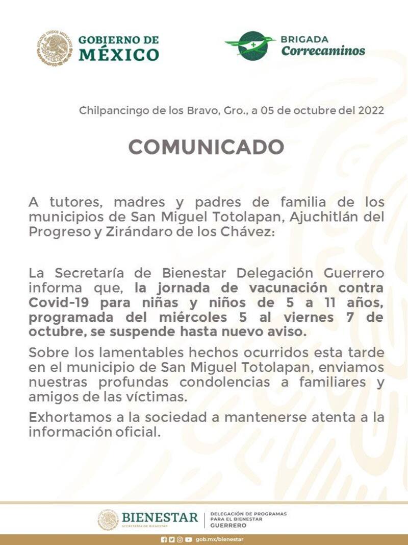 Tras la violencia que vivió en San Miguel Totolapan, el gobierno decidió cancelar la jornada de vacunación contra COVID-19 para niños de 5 a 11 años mediante comunicado.