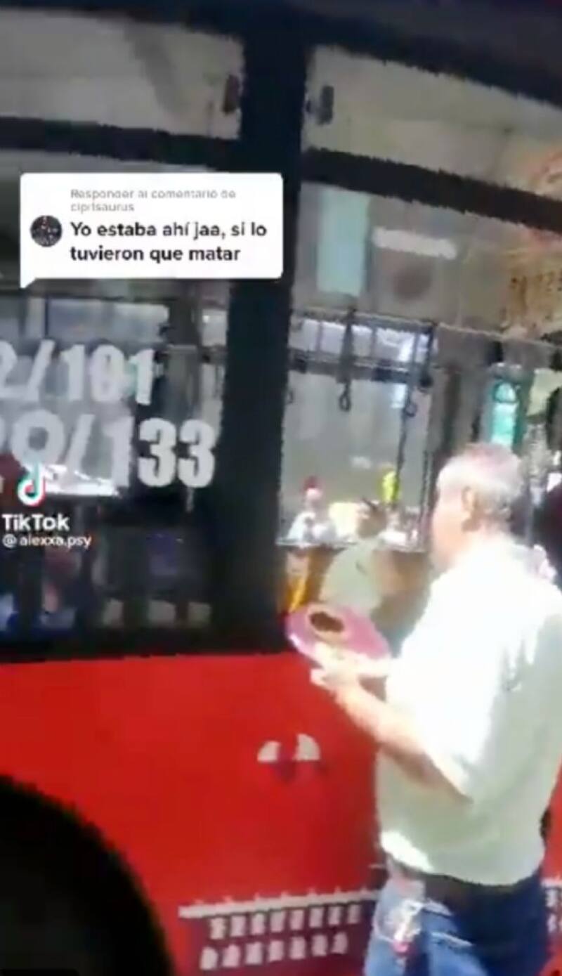 Mientras sucedían los golpes y disparos, afuera, en una parada de autobús, la TikToker grabó con su celular los detalles cruciales de la situación; sin embargo, en determinado momento algo atrajo su atención y enfocó a un hombre que, con su plato de taquitos en una mano, observaba todo con detenimiento sin dejar de disfrutar su comida.