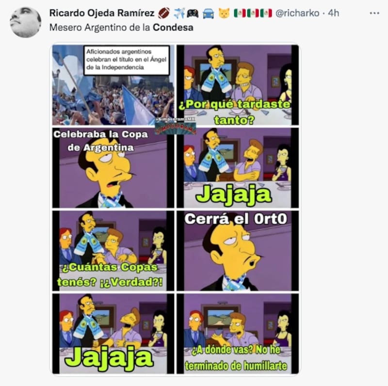 Muchas veces el futbol puede sacar lo peor de las personas y ahora, con el nuevo campeonato de la Selección Argentina en el Mundial de Qatar 2022, no ha sido la excepción, ya que usuarios en Twitter han compartido todo tipo de burlas y chistes de mal gusto en contra de los sudamericanos que trabajan como meseros en la capital.