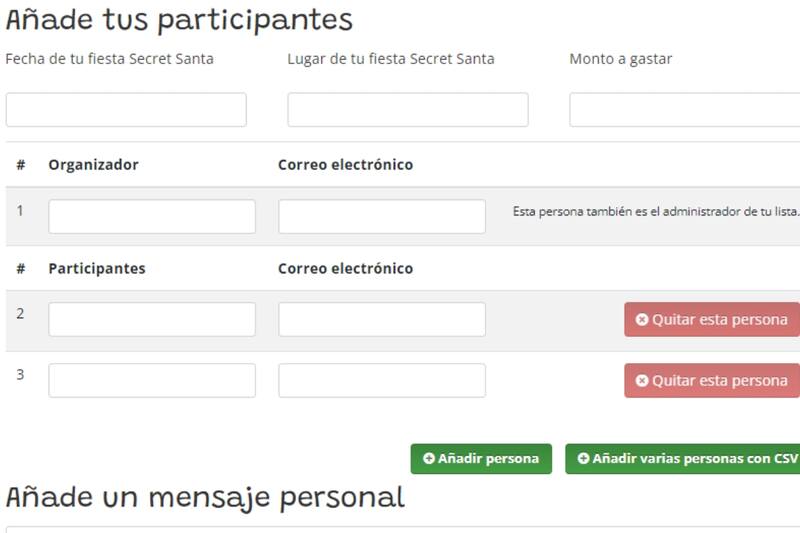 El sitio web es Secret Santa Organizer, este te permite crear una lista de tus amigos, familiares o compañeros de trabajo que entrarán en el intercambio. Solo necesitarás sus nombres y correos electrónicos, pues el sitio les enviará un mensaje con la persona a la que deben de darle un regalo y un mensaje, el cual puedes modificar y así incluir algunas opciones, observaciones e incluso restricciones.