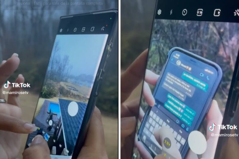 El hombre se encuentra en el patio, la joven lo ve a través de una ventana y con su celular que es un Samsung S22, empieza a grabar al sujeto, sin embargo y gracias al poderoso zoom que este teléfono posee, la mujer logra capturar la conversación que su pareja está teniendo.