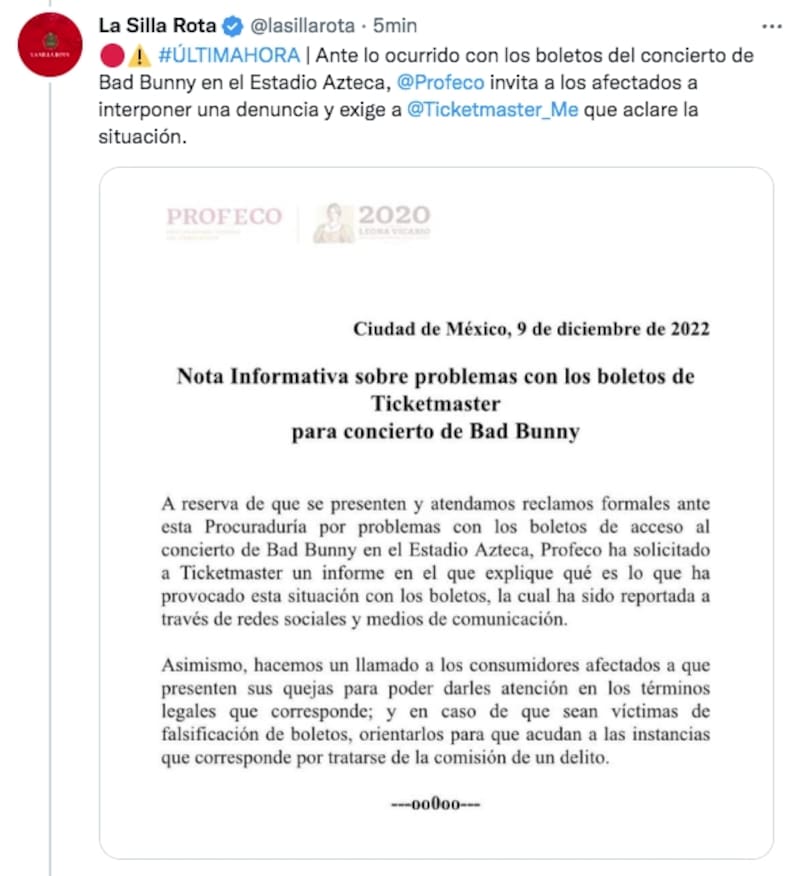 Medios difunden supuesto comunicado de la Profeco por la polémica de los boletos de Bad Bunny que resultó ser falso