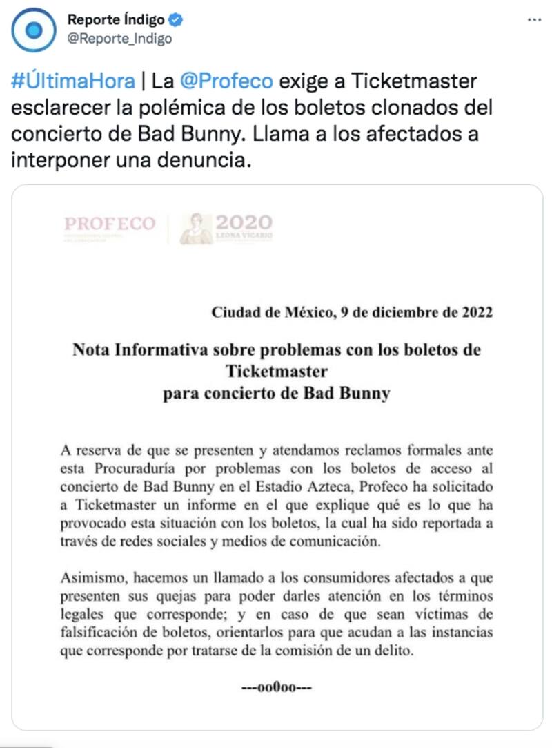 Después que el Estadio Azteca emitió un comunicado a través de redes sociales en el que intentaron aclarar la situación de los boletos falsos para la primera fecha de Bad Bunny, comenzó a circular otro supuesto documento de la Procuraduría Federal del Consumidor (Profeco).
