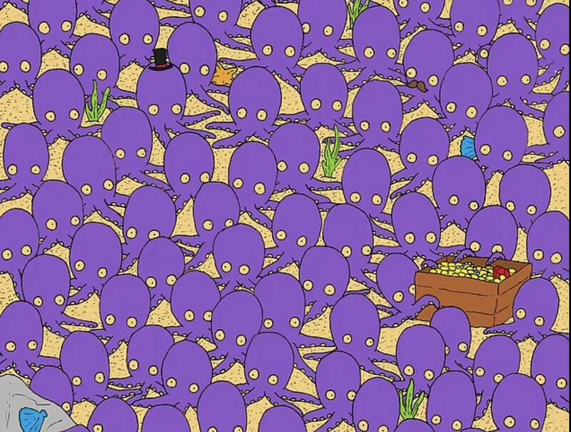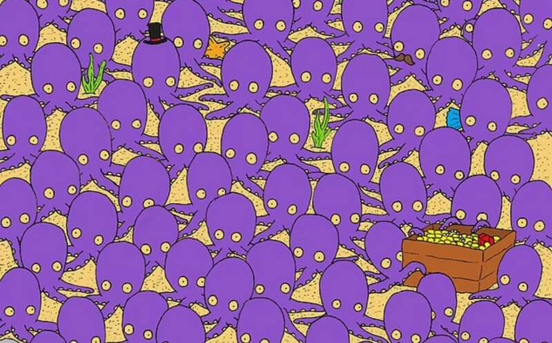 El día de hoy te compartimos un reto creado por el maestro de las ilustraciones virales: Gergely Dudas, también conocido como Dudolf. Se trata de un dibujo con temática subacuática que desafía a los jugadores a encontrar al único pez nadando entre un montón de pulpos nadando junto a un cofre del tesoro rebosante de monedas de oro.