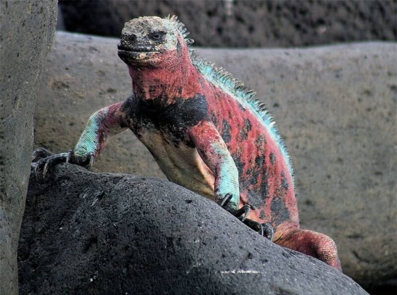 Se trata de una especie de iguana marina, cuyo nombre científico es Amblyrhynchus cristatus. Habita las costas rocosas de este archipiélago ecuatoriano y se alimenta de algas marinas. Su tamaño en machos adultos llega a alcanzar los dos metros de largo, mientras que las hembras llegan a medir únicamente medio metro. Las profundidades que se somete este animal son aproximadamente de 20 metros, según expertos.