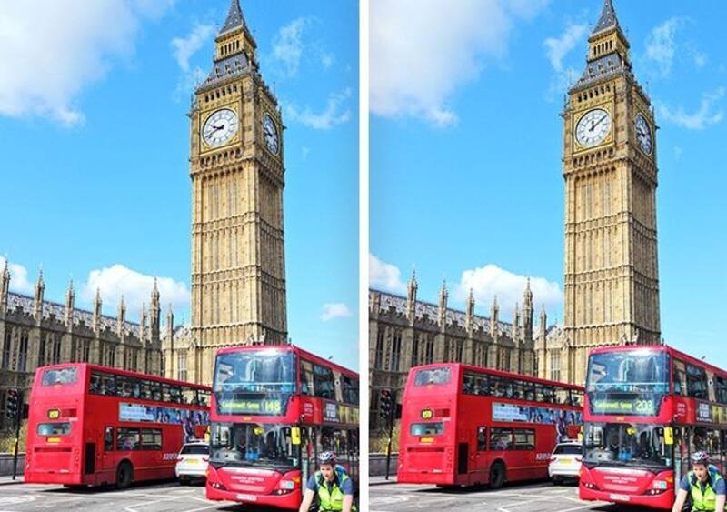 Londres es la capital de Inglaterra y se encuentra situada en las orillas del Río Támesis, en ella están varias de las edificaciones más importantes y bellas del mundo. A continuación te dejamos una imagen en donde se observa el Big Ben, el Castillo de Westminster. y los característicos autobuses rojos de esta ciudad que se llaman double decker. El reto consiste en encontrar las 4 diferencias en 10 segundos.