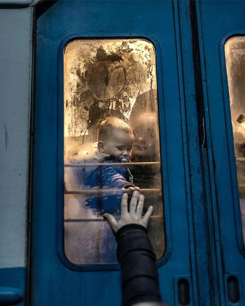 Taras (el padre del bebé) llora cuando dice adiós a su hijo Matviy. Su mujer Kristina ha dibujado un corazón en la puerta del tren. Taras se ve obligado a quedarse atrás, escribe el fotoperiodista.