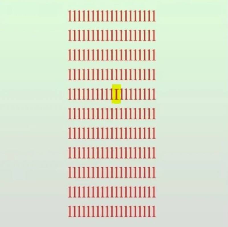 En la imagen, compartida en Facebook, se puede observar una lámina repleta de letras "1", pero dentro de ella se esconde una letra "I", el reto visual consiste en identificarla en 30 segundos. ¿Puedes hacerlo?