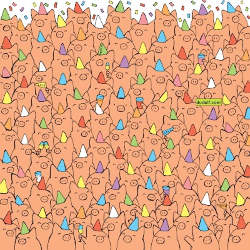 En esta ocasión, debes prestar toda tu atención a esta imagen de Dudolf, revisar con detalle cada centímetro de ella y ubicar a los cerditos que no cuentan con un sombrero festivo, estos son tres y se encuentran distribuidos en toda la fiesta. ¿Preparado?