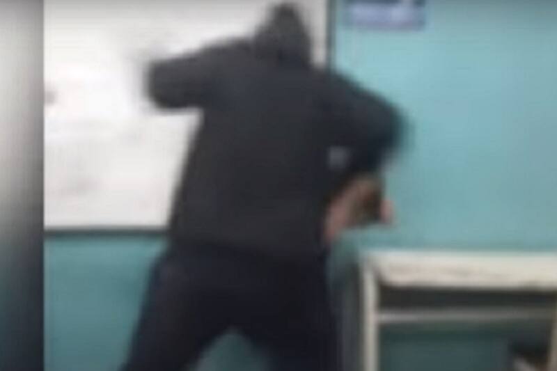 Segundos después de que el joven de negro se retira del lugar, el niño sentado le dice algo, lo cual no se logra a escuchar en la grabación, por lo que otro niño regresa enfurecido; hace a un costada la silla y azota, en repetidas ocasiones, la cara del niño sentado a la mesa del escritorio.