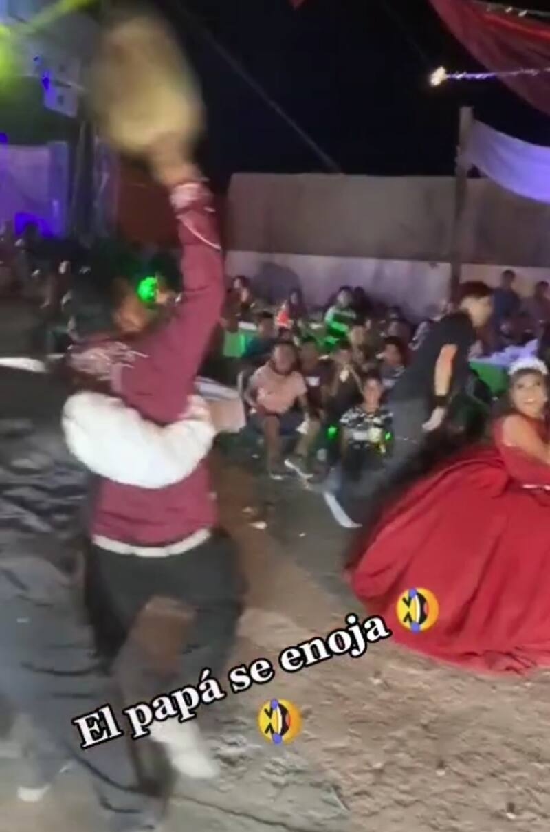 El video viral en cuestión entra justamente aquí, pues durante una de los bailes planeados, los chambelanes empiezan a hacerle un tipo de 'striptease' a la cumpleañera, hecho que no le pareció al papá por lo que decidió abalanzarse en contra de los jóvenes, pero un mesero lo detuvo.