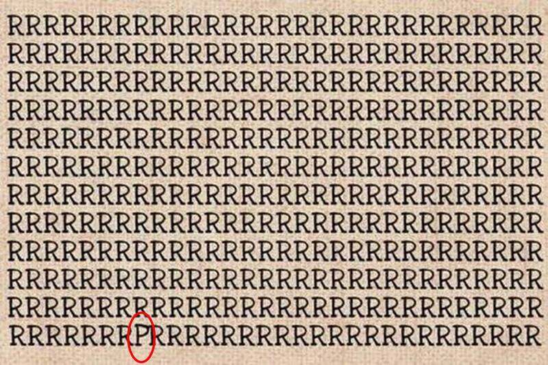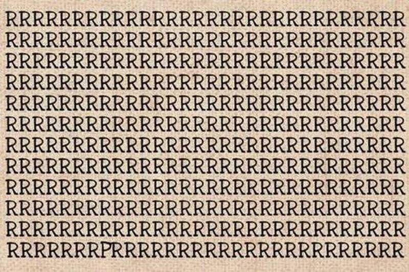 En la imagen, compartida en redes sociales, se puede observar una imagen repleta de letras "R", pero dentro de ella hay una "P". El reto visual consiste en identificarlos en 20 segundos.