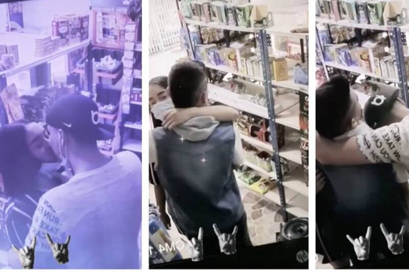 En la grabación que circula en redes sociales se muestra el momento en que dos jóvenes se besan apasionadamente dentro de una tienda, pero de manera repentina ambos se separaron debido a que el novio de la chica (y amigo del joven) se acercaba al sitio donde estaban.