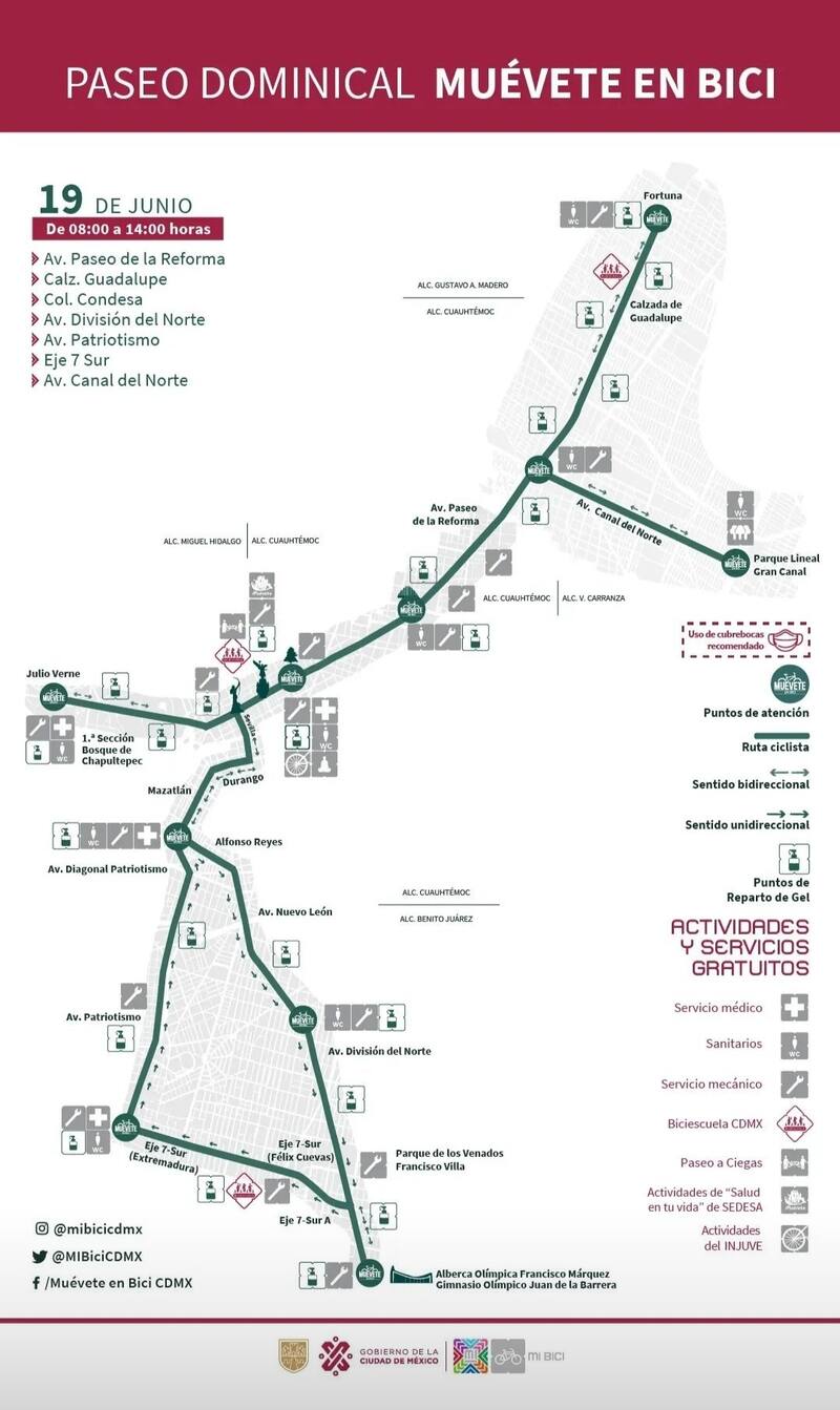 El Paseo Dominical "Muévete en Bici" conecta cuatro alcaldías de la CDMX (Cuauhtémoc, Benito Juárez, Gustavo A. Madero y Miguel Hidalgo) y el recorrido pasa por División del Norte, Patriotismo, Eje 7 Sur y el tramo que va de Julio Verne a Fortuna.