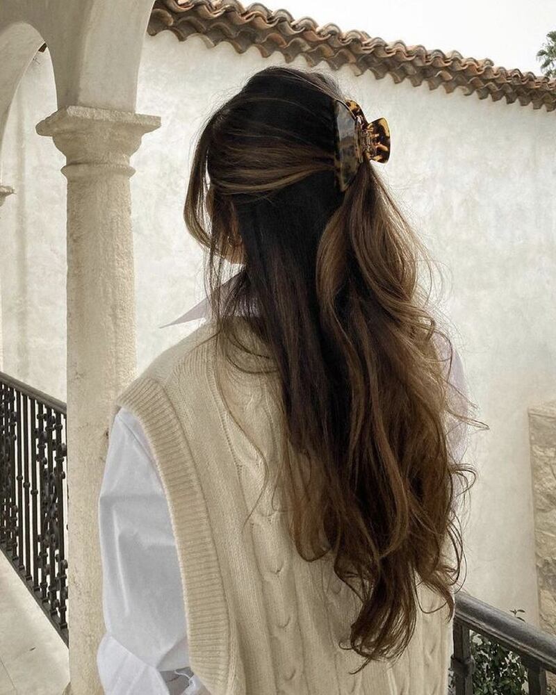 Se trata de una coleta sostenida con una pinza grande y aspecto vistoso, esta coleta brilla por su volumen y caída ligera, ideal para lucir una cabellera con gran movimiento. Lo mejor de todo es que puedes conseguirla en cuestión de segundos, sin importar la textura que tenga tu cabello.