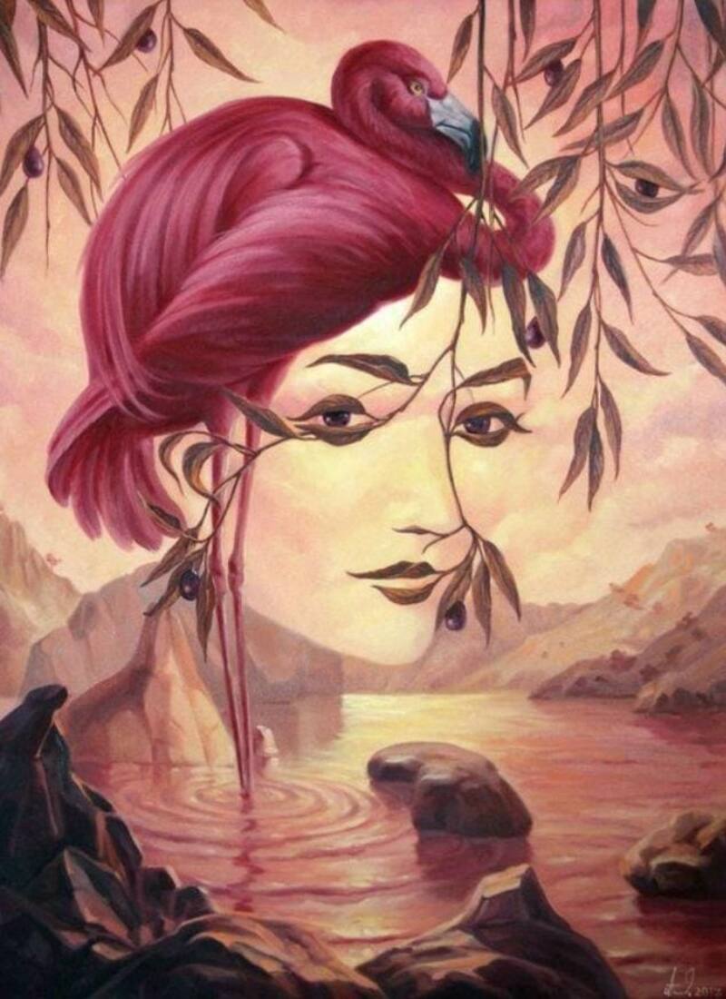 A continuación, observarás la imagen que se logra ver dos figuras, el rostro de una mujer, un paisaje con un flamingo debes de elegir uno el que más te guste. Esta te permitirá conocer aspectos de tu forma de ser que, quizás desconocías.