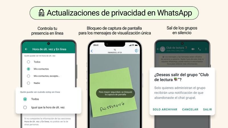 Las nuevas medidas de seguridad se centran en tres aspectos: los grupos, la visibilidad de conexión de los usuarios y bloqueos en capturas de pantalla para ciertos mensajes. Estas se aplicarán a partir de este mes, de acuerdo con lo informado por la empresa. No se especificó el día