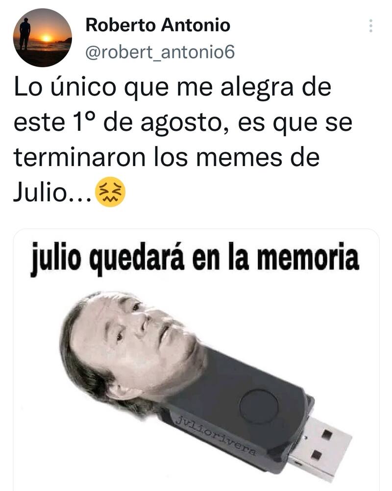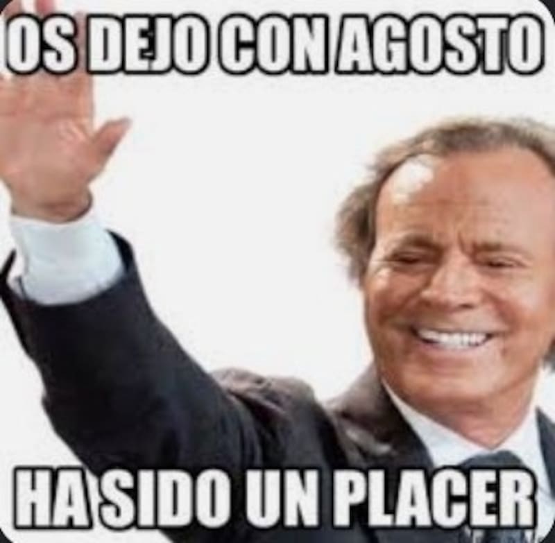 Sin duda los memes se han convertido en una de las formas más divertidas que los internautas utilizan para expresarse en las redes sociales, que independientemente de si son graciosas o no, la mayoría de las veces cobran gran popularidad. Justamente esto ocurrió con los memes del pasado mes de julio, en donde muchos aprovecharon la imagen del cantante español Julio Iglesias para hacer divertidas imágenes a lo largo de todo el mes; y que a pesar del que el séptimo mes terminó, las imágenes volvieron a aparecer para despedir a julio y darle la bienvenida a agosto.