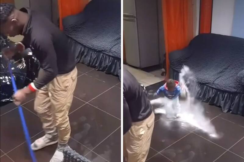El bebé tira todo el contenido de la bolsa en el piso, el cual es un polvo blanco que parece harina, su padre ve la escena y no duda en reclamarle, pero antes de que pueda agarrar al menor, este sale corriendo mientras ríe por su travesura.