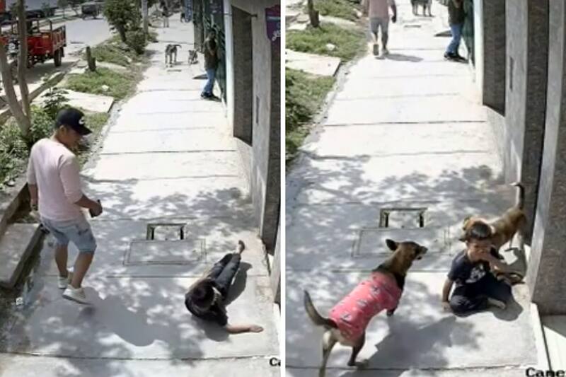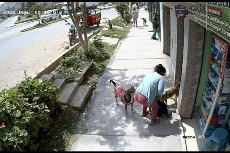 Más adelante se pueden observar a tres perros, uno de ellos viene corriendo a toda velocidad y se impacta contra el niño, haciendo que este tenga una gran caída, de inmediato el pequeño comienza a llorar y una mujer va por él y lo levanta, mientras el perrito que ha sido culpable del accidente solo los mira y sigue ladrando.