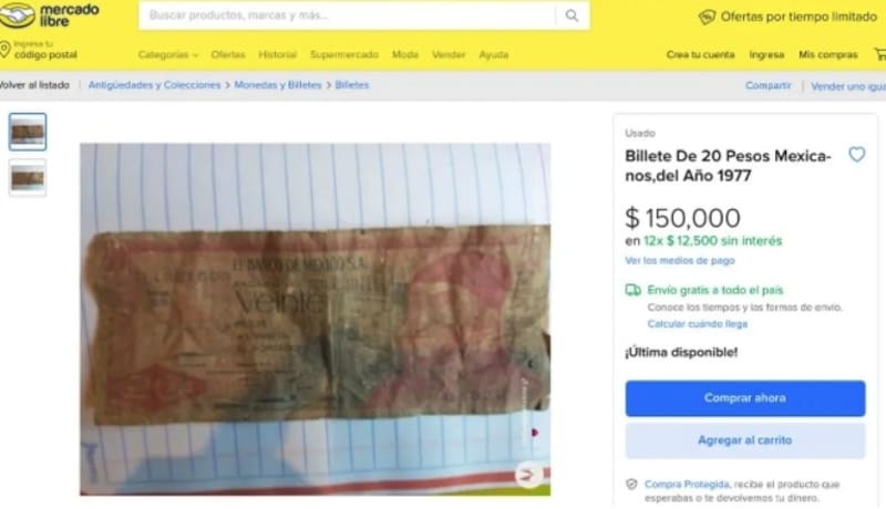 A través de Mercado Libre, se compartió una publicación que fue un éxito y en la que se entregan hasta 150 mil al propietario de un billete de 20 pesos antiguo, el cual mencionan que es del año 1977 y que pertenece a la familia AA en el número de serie, hecho que ha llamado la atención entre coleccionistas, ya que en estos tiempos es muy difícil encontrar un papel moneda de ese año.