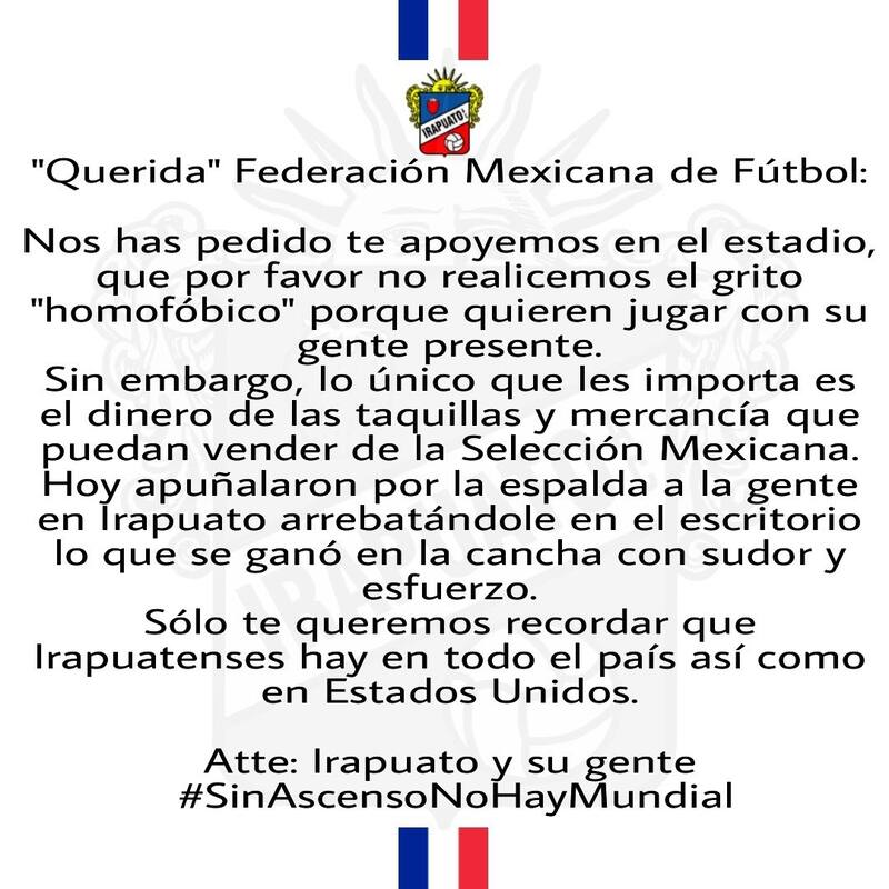 Esta situación ha llevado que las redes sociales se manifiesten y en Twitter han viralizado una imagen, donde los aficionados piden solidarizarse con Irapuato y buscan afectar los intereses de la Selección Mexicana y de la FMF, donde los calificaron como personas que solo buscan el dinero de las taquillas, dejando de lado el espíritu deportivo. Además, se ha convertido en tendencia el hashtag “#SinAscensoNoHayMundial”.